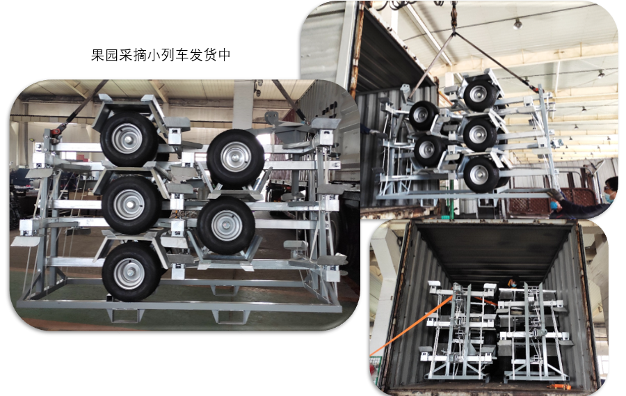 采摘列車結構設計簡潔堅固;整車采用熱浸鋅表面處理工藝,經(jīng)久耐用;果筐放置處設有4套經(jīng)過調校的果筐減震裝置,相比傳統(tǒng)運輸車能極大地減少果品運輸途中的損傷率,提高經(jīng)濟效益。輪胎采用高爾夫球車寬體輪胎,能有效減少坑洼路面對果品的顛簸。每4-6列為一個編組,每組列車帶有拖拉機牽引支架1件,存放收納支架1件,方便使用和存放。