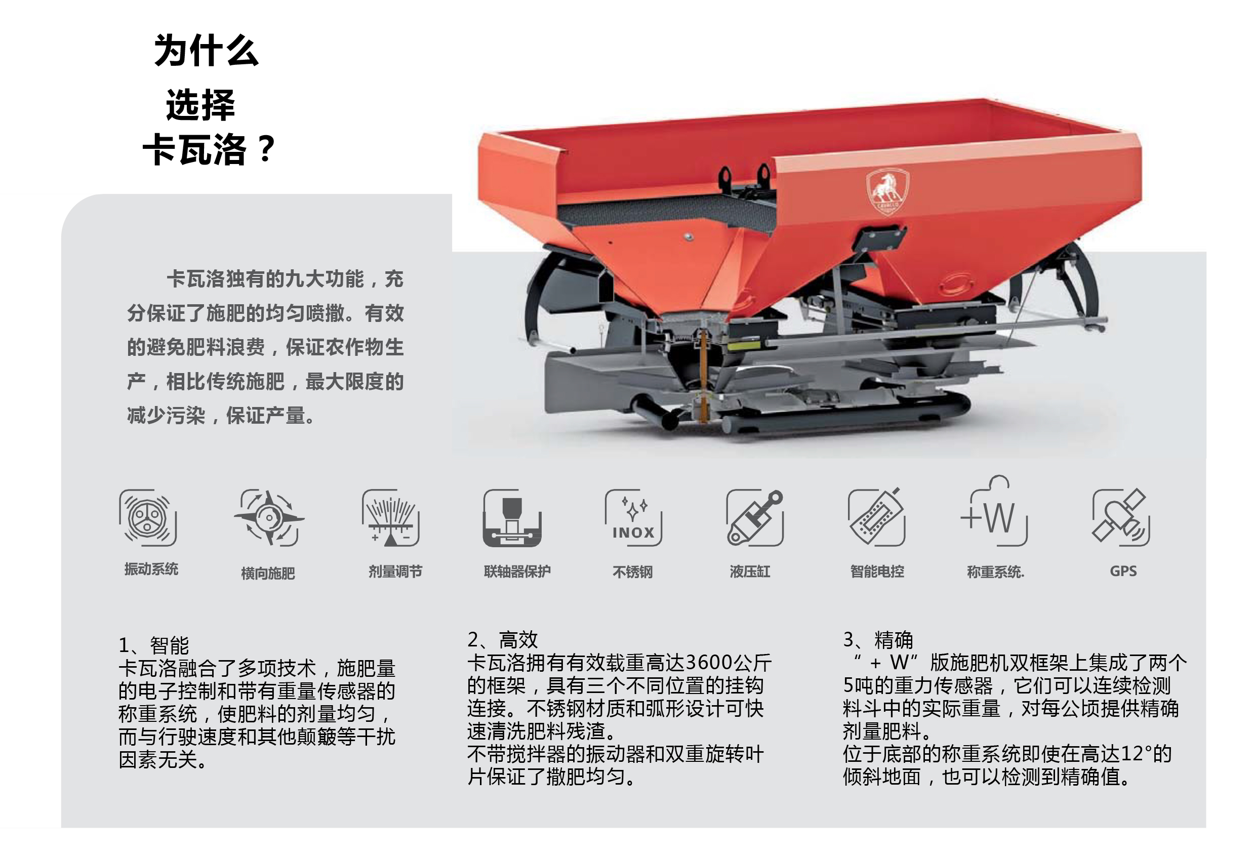 卡瓦洛獨(dú)有的九大功能,充分保證了施肥的均勻噴撒。有效的避免肥料浪費(fèi),保證農(nóng)作物生產(chǎn),相比傳統(tǒng)施肥,最大限度的減少污染,保證產(chǎn)量。